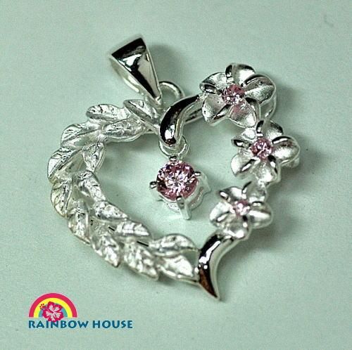 ハワイアンジュエリー揺れる一粒ジルコニア(ピンク)付マイレと花ハートペンダントヘッド