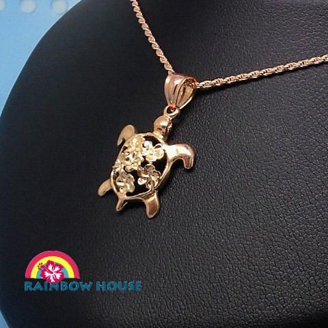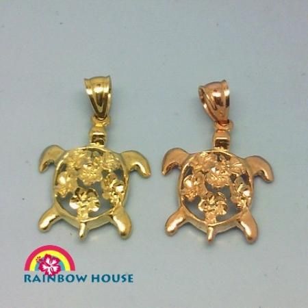 ハワイアンジュエリーK14ピンクゴールド透かしHONU甲羅にプルメリアが乗っているペンダントTOP